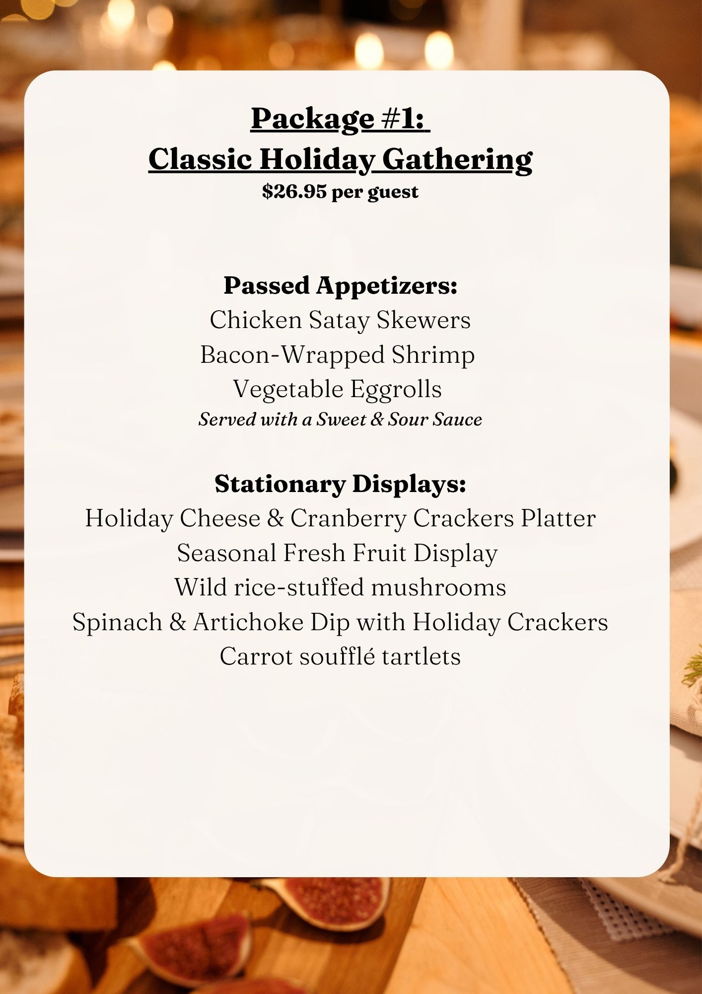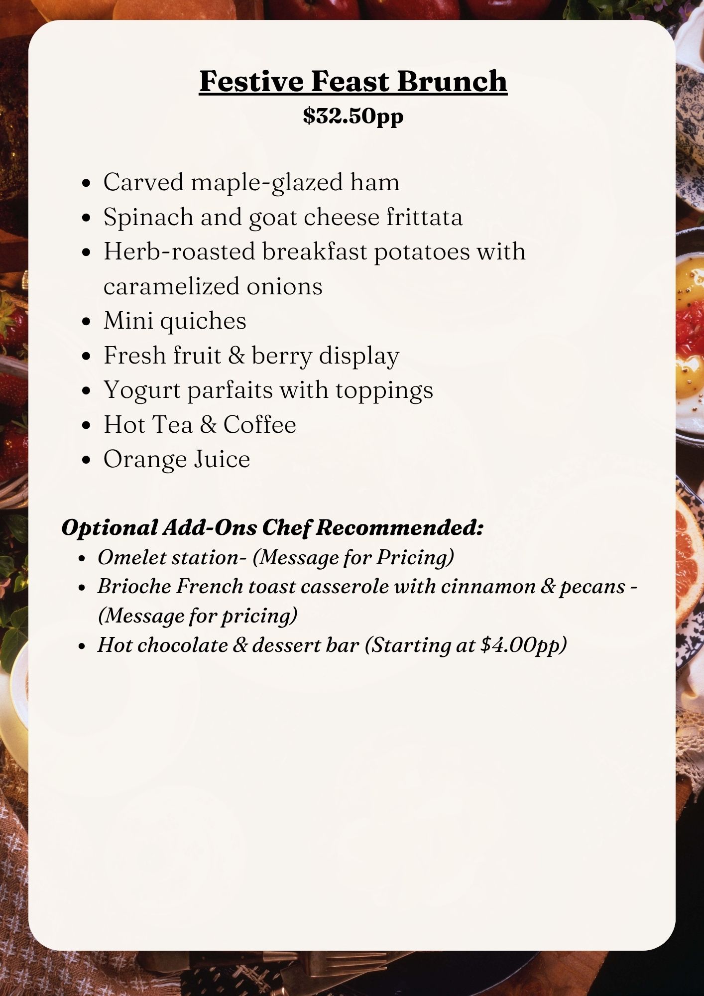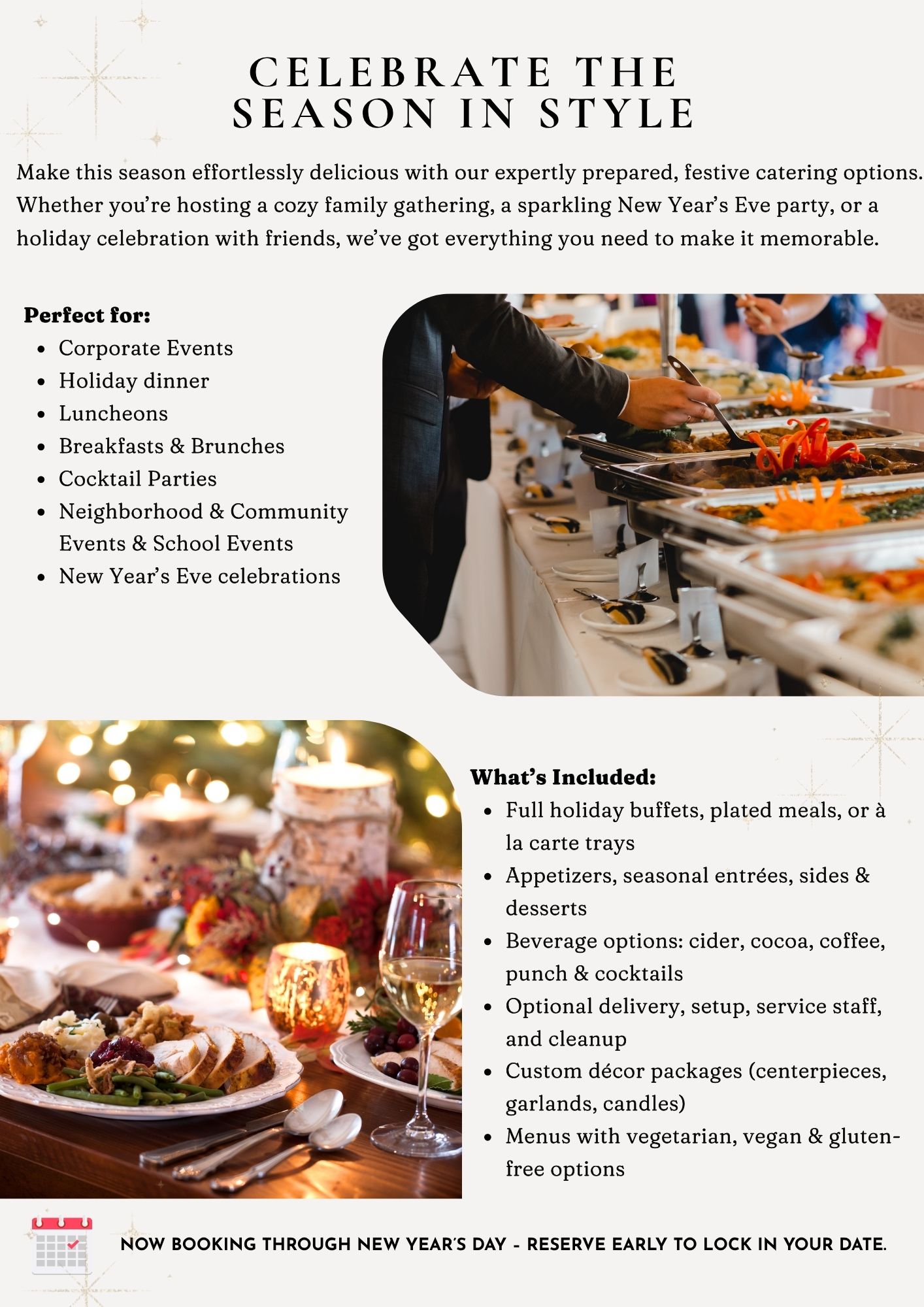 From Thanksgiving dinners and holiday luncheons to elegant dinner parties, corporate celebrations, family gatherings, and New Year’s events, our team brings the perfect blend of flavor, presentation, and service to every occasion.