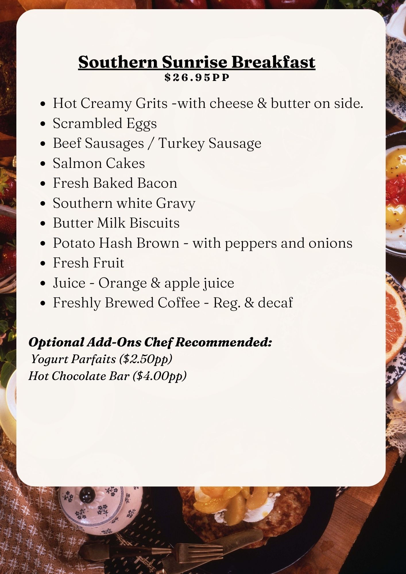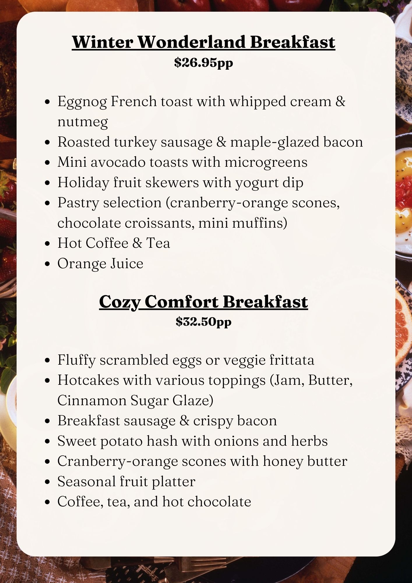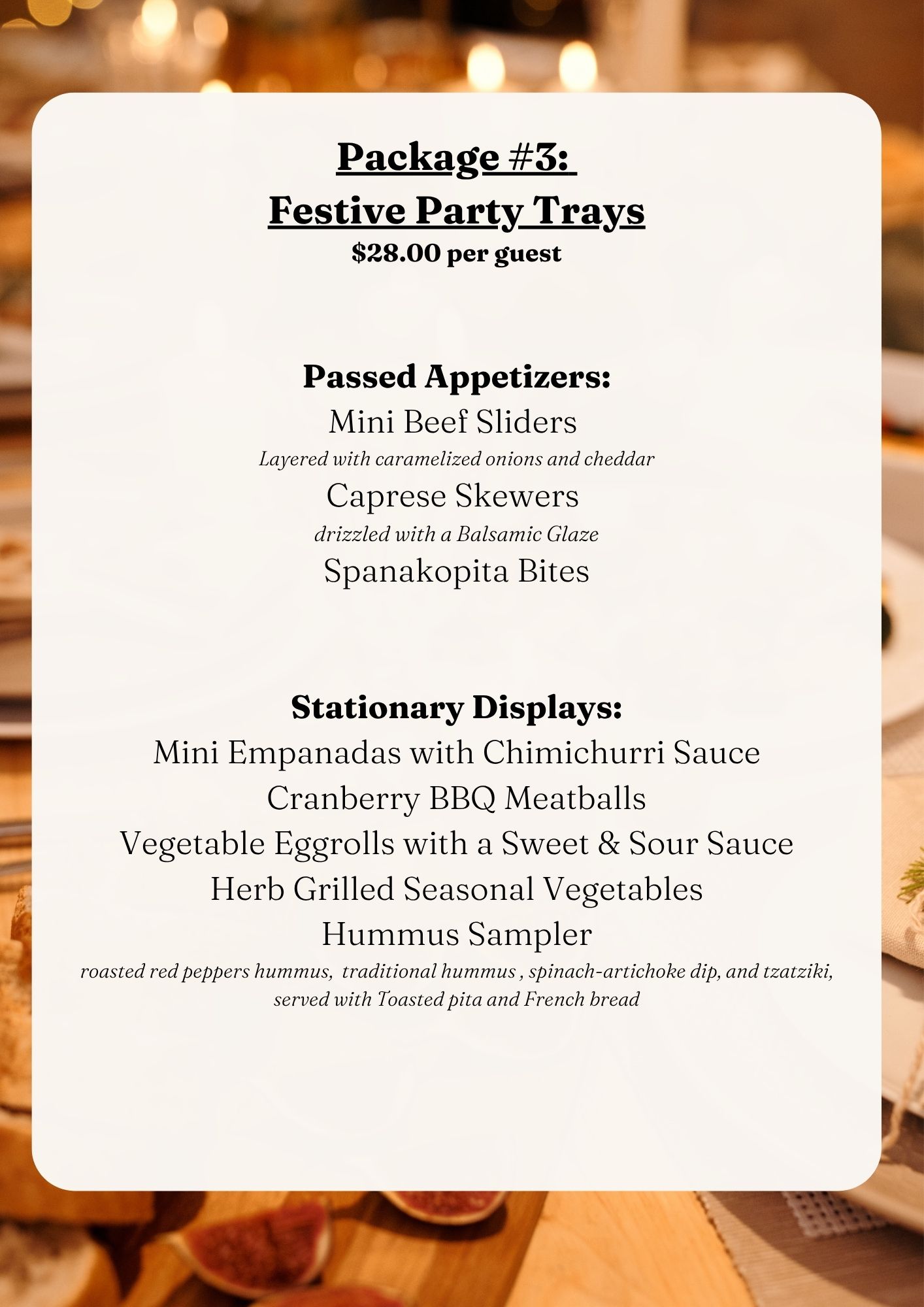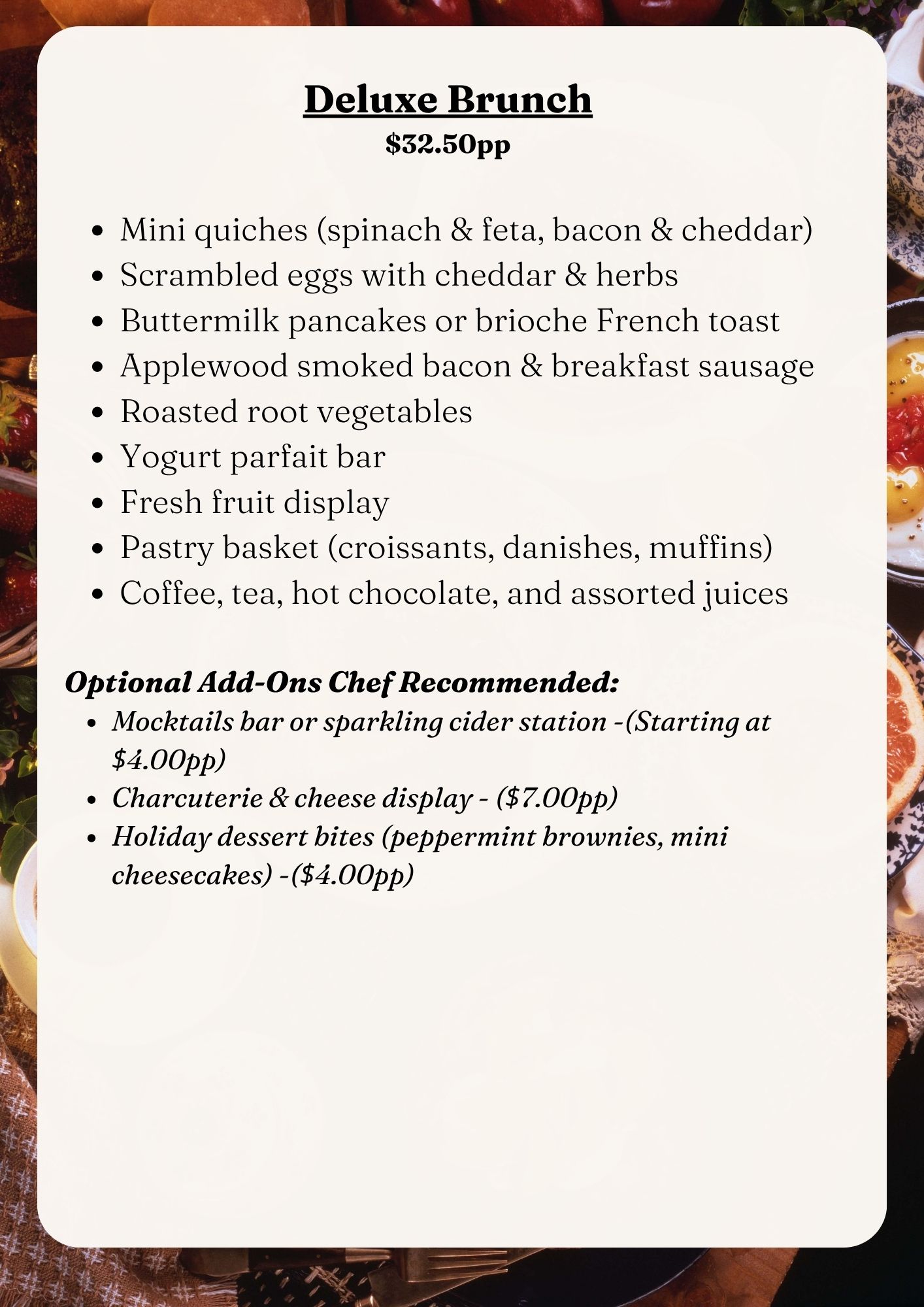 From Thanksgiving dinners and holiday luncheons to elegant dinner parties, corporate celebrations, family gatherings, and New Year’s events, our team brings the perfect blend of flavor, presentation, and service to every occasion.