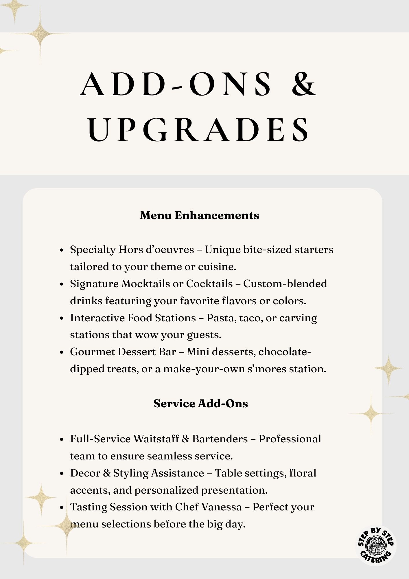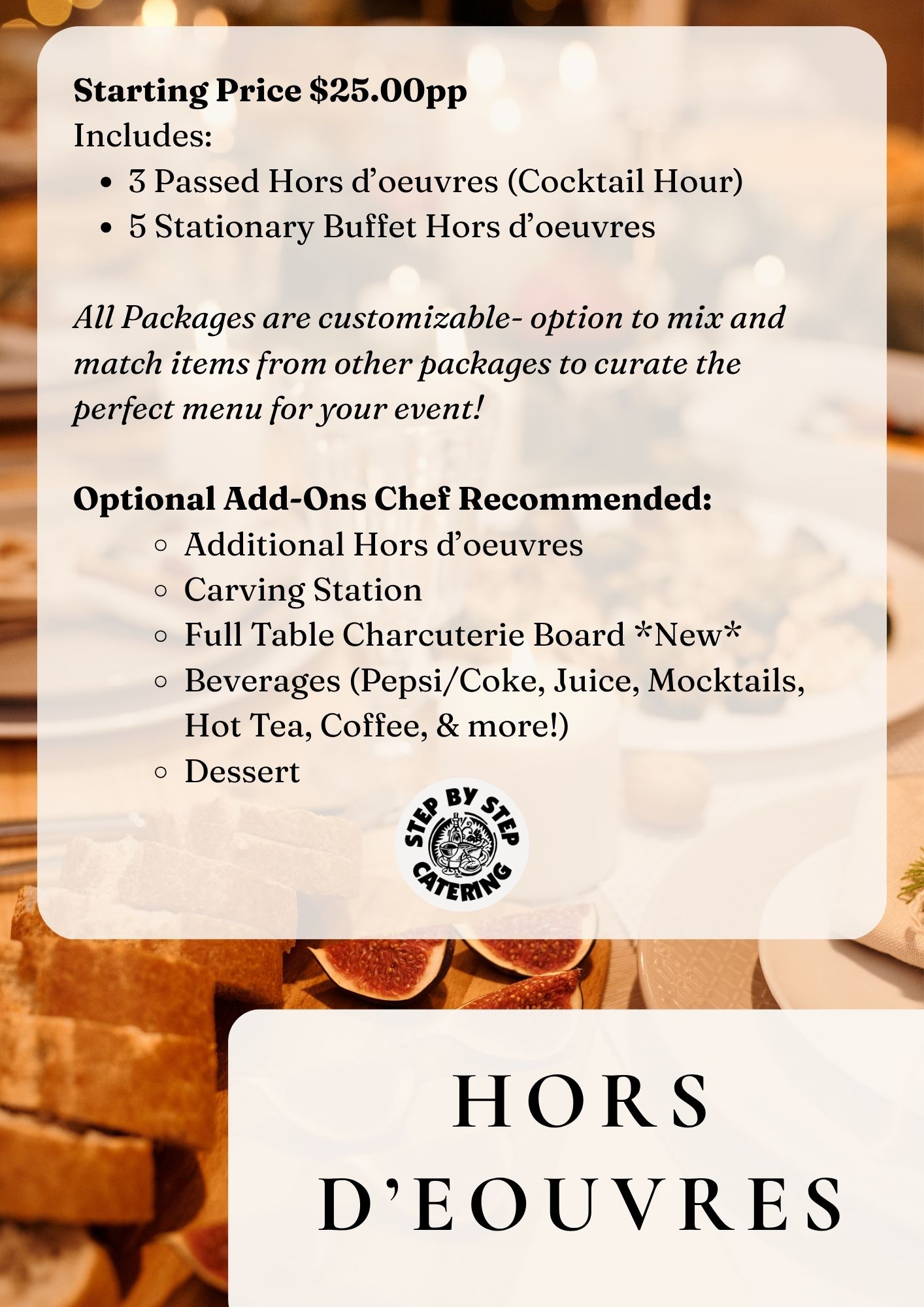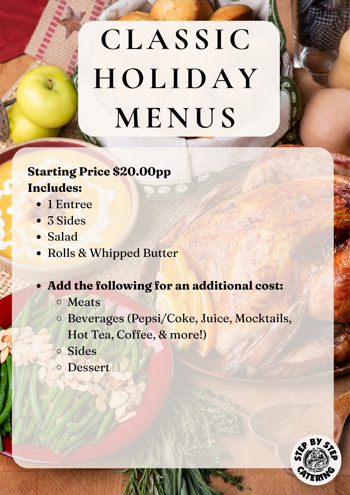 The holidays are fast approaching, and Step By Step Catering is here to make every celebration delicious and stress-free! We are thrilled to share our 2025 Holiday Catering Catalog, featuring seasonal menus and customizable packages perfect for all your festive occasions.